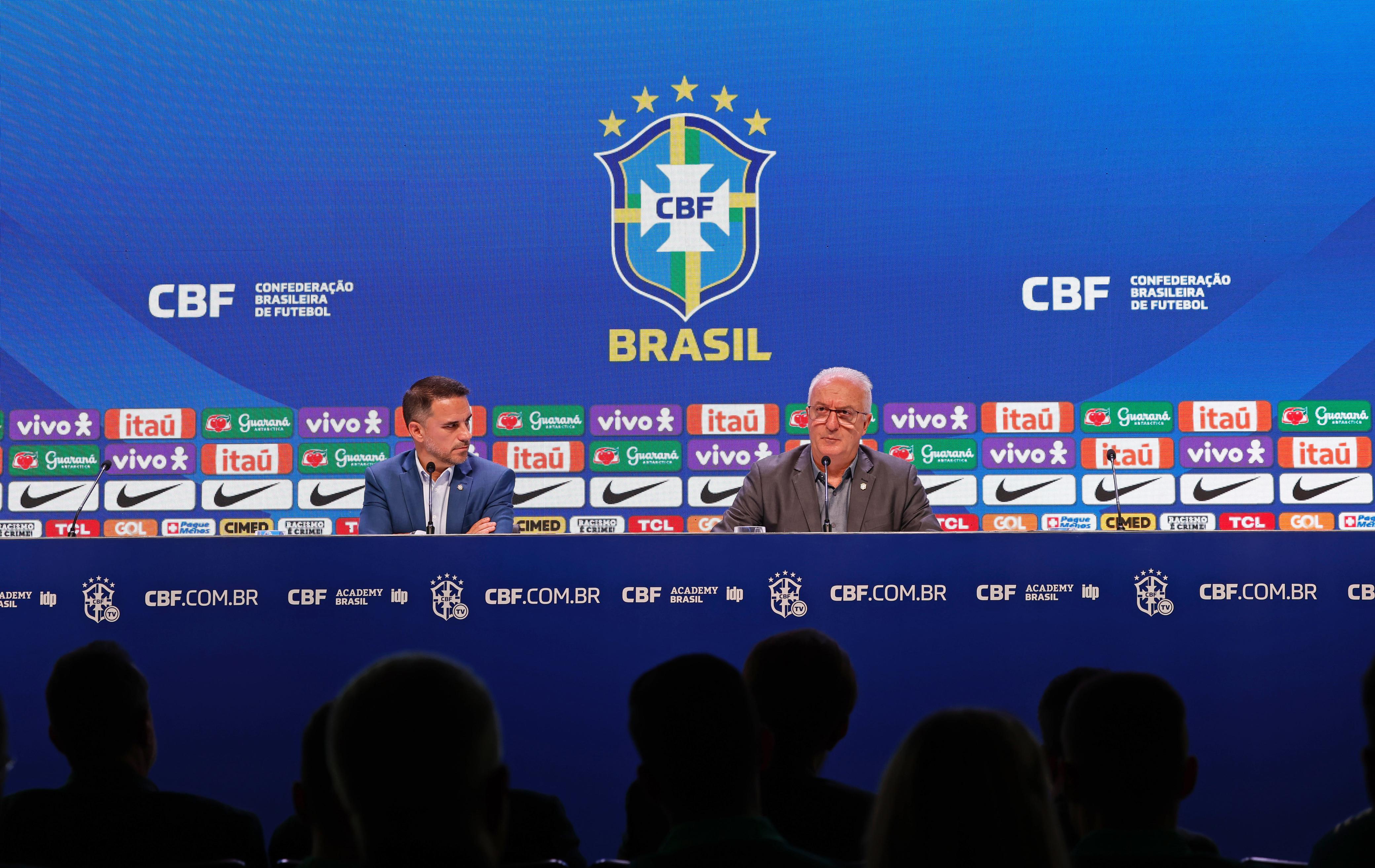 Rodrigo Caetano e Dorival Junior durante a convocação da Seleção Brasileira para os jogos contra Equador e Paraguai pelas EliminatóriasCréditos: Rafael Ribeiro/CBF