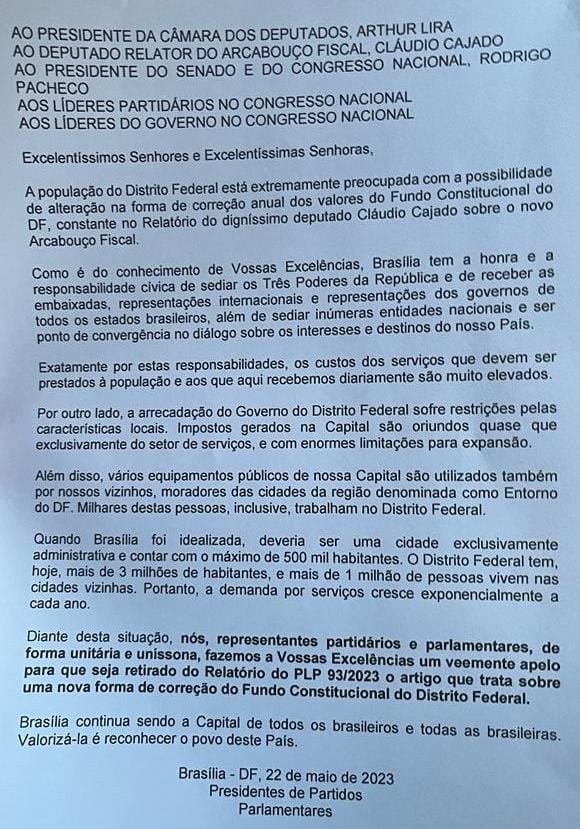 Diante da relevância da matéria, senadores, deputados federais e distritais, independentemente de orientação política, uniram-se contra a mudança no fundo e assinaram a carta. Assinaram o documento PSD, PT, PV, PDT, PSB, PSDB, PP, União Brasil, PL, MDB, Cidadania, PSC, Podemos, Avante, Republicanos, PCdoB, PSol e PMN.