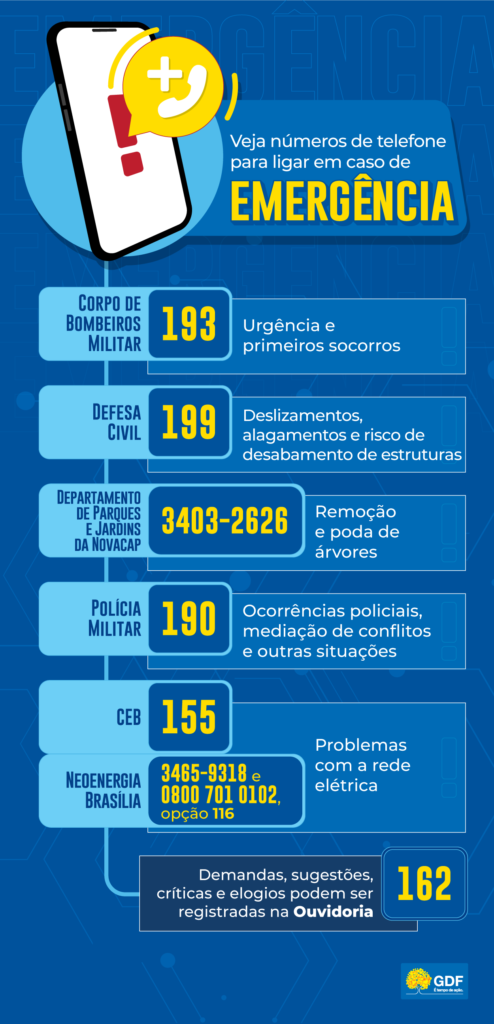 Ao notar sinais de risco à segurança, a população deve acionar o CBMDF pelo telefone 193. Se houver ameaça de desabamento de estruturas, chame também a Defesa Civil, pelo 199. O órgão envia alertas sobre fortes chuvas por SMS para a população. Para receber, basta enviar o CEP da residência para o número 40199.