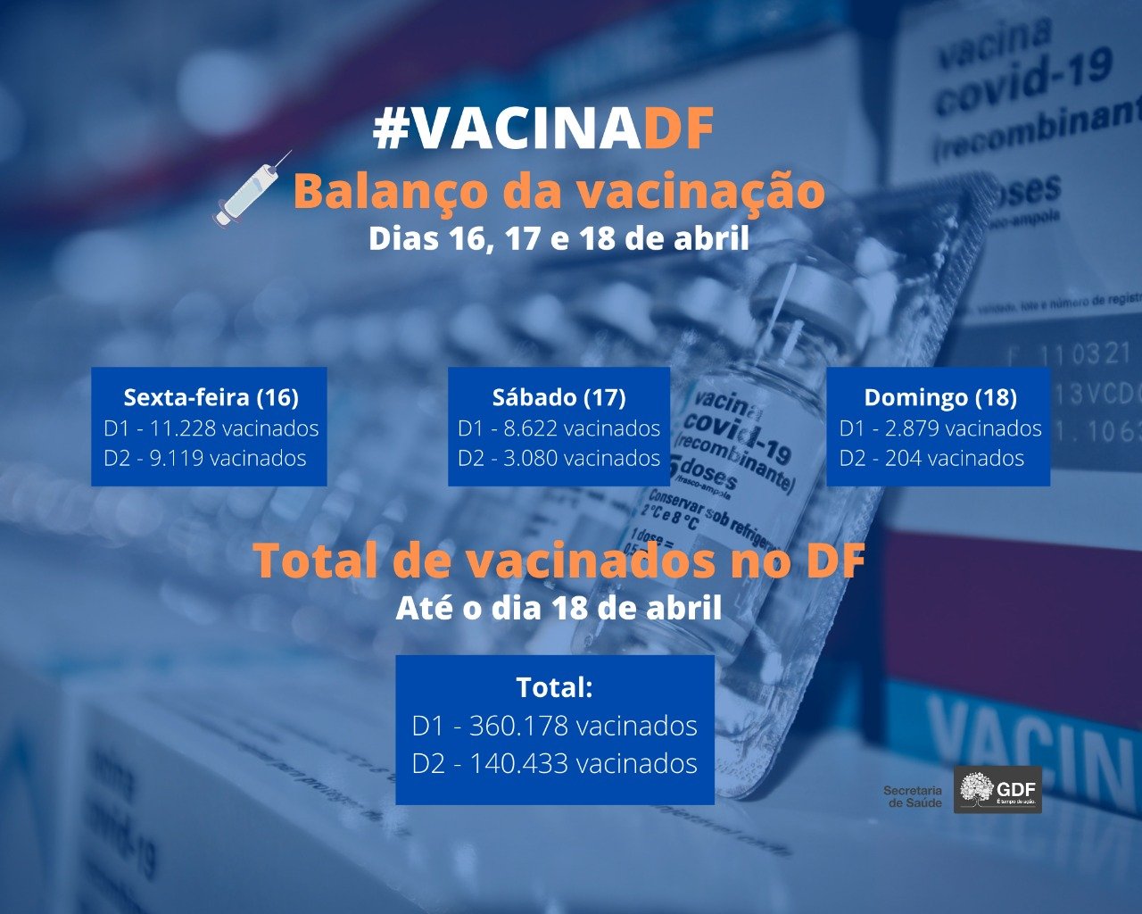 Até o momento, a Secretaria de Saúde já vacinou 360.178 vacinados pessoas com a primeira dose (D1) e 140.433 com a segunda dose (D2). A cobertura vacinal daqueles que receberam a primeira dose é de 15,55% e de 6,11% de quem recebeu o reforço. A porcentagem considera a população elegível para receber a vacina, que são adultos acima de 18 anos. Esse público é estimado em 2.309.944 habitantes, segundo dados da Codeplan.