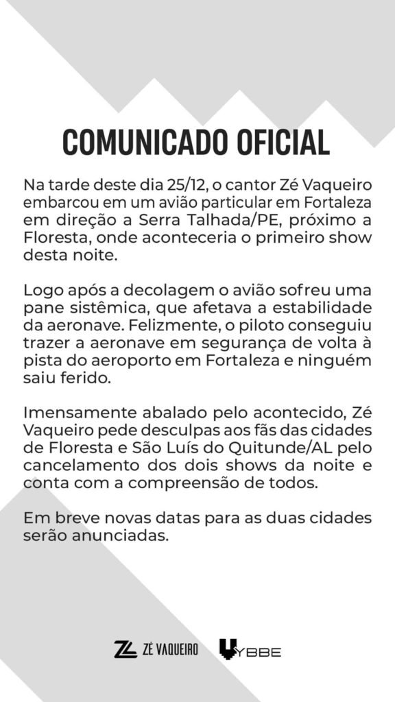 Abalado, o cantor precisou cancelar os shows que estavam marcados para a noite deste domingo nas cidades de Floresta/PE e São Luís do Quitunde/AL. Em comunicado divulgado pouco após o episódio, a assessoria de Zé Vaqueiro informou que novas datas serão anunciadas para as apresentações nas respectivas cidades.